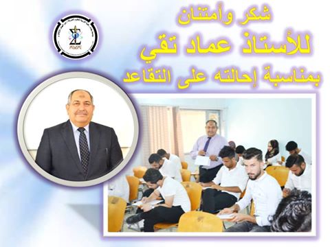 شكر وأمتنان للأستاذ المساعد عماد تقي بمناسبة احالته على التقاعدIhcoedu2017-05-04وفاءاً وإحتراماً بالمقام الرفيع لأساتذتنا الأعزاء وتقديراً للجهود التي قدمها الأستاذ المساعد عماد تقي علي ... مدير الموارد البشرية والتدريسي في كليتنا.....المزيد