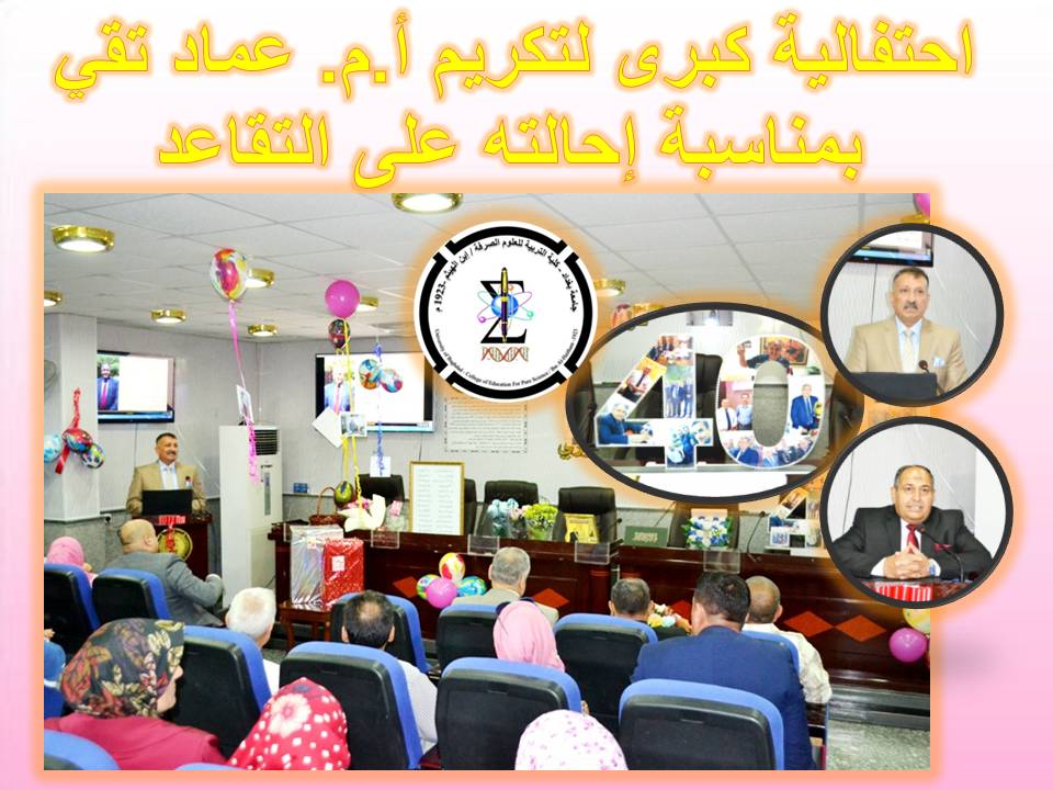 احتفالية كبرى لتكريم أ.م. عماد تقي بمناسبة إحالته على التقاعدIhcoedu2017-05-17بحضور أ.د. خالد فهد علي عميد الكلية وضيف الكلية أ.د. وليد الحلي مستشار رئيس الوزراء لشؤون التعليم العالي احتفلت كليتنا بالاستاذ المساعد....المزيد