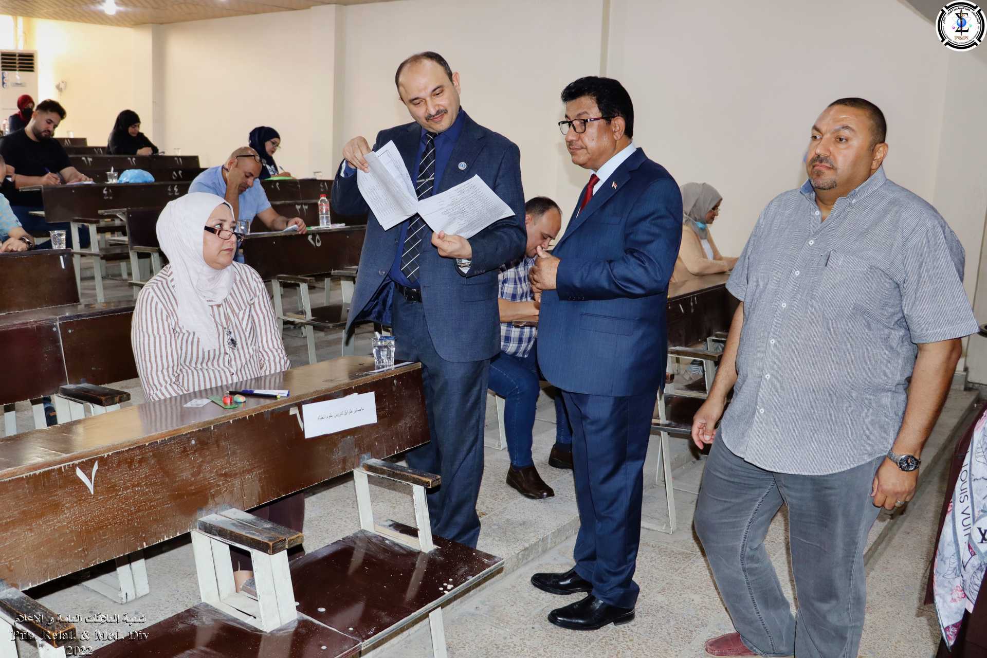 تفقد عميد الكلية أ.د. فراس عبد الحميد عبد اللطيف و معاوناه للشؤون العلمية و الدراسات العليا أ.د. حسن احمد حسن و للشؤون الادارية أ.د. حسن كامل رسن ، الامتحان التنافسي للطلبة المتقدمين للقبول في الدراسات العليا في اقسام كليتنا للعام الدراسي 2022-2023 ..