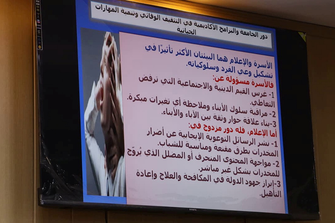 وهدفت الورشة الى تعريف الطلبة بمخاطر واثر المخدرات على الطلبة الجامعيين، ولاسيما تأثيراتها الاجتماعية والعقلية والجسدية. كما تناولت الورشة اعراض تعاطي المخدرات والعلامات التي يمكن ان تظهر على الطالب المدمن، بما يسهم في الكشف المبكر وتقديم الدعم المناسب.