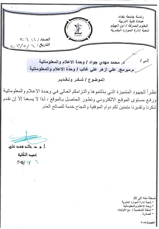 بأيعاز من السيد عميد كلية التربية للعلوم الصرفة /ابن الهيثم أ.م.د. خالد فهد علي الجبوري وبموافقة من جميع أعضاء مجلس الكلية وجه مجلس الكلية كتاب شكر وتقدير الى وحدة الاعلام والمعلوماتية والموقع الالكتروني في الكلية وذلك في يوم الاربعاء الموافق 6/5/2015 , نظراً للجهود المتميزة التي يبذلها منتسبوا الوحدة في متابعة نشاطات الكلية ونشرها على الموقع الالكتروني بسرعة قياسية وبأبهى حلة ومظهر شهد عليها كل من يتابع ماينشرها لموقع الالكتروني والذي أقترب عدد متابعيه من المليون متابع وكثرة عدد المقيمين له من متصفحي الانترنيت و وجه كتاب الشكر والتقدير الى كل من د.محمد مهدي جواد مدير وحدة الاعلام والمعلوماتية والموقع الألكتروني والى المبرمج علي أزهر علي غالب , وهو مايعكس إهتمام عمادة الكلية  بهذا المرفق الحيوي المهم.